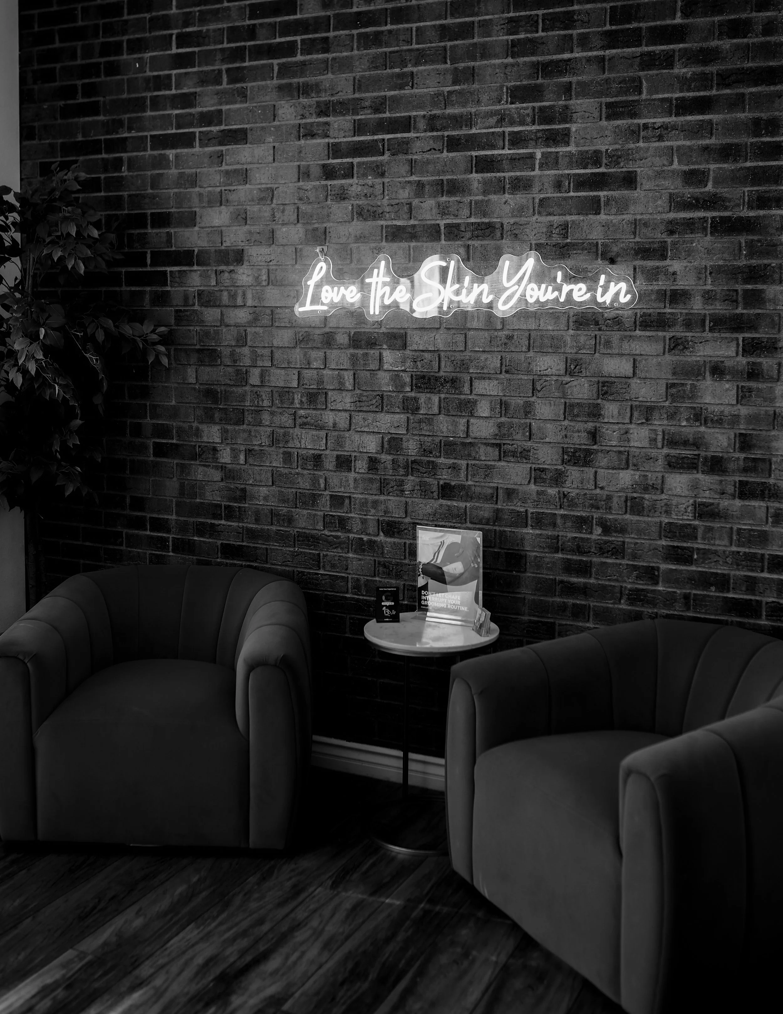 Neon sign on a brick wall inside of waxing center in Albuquerque New Mexico